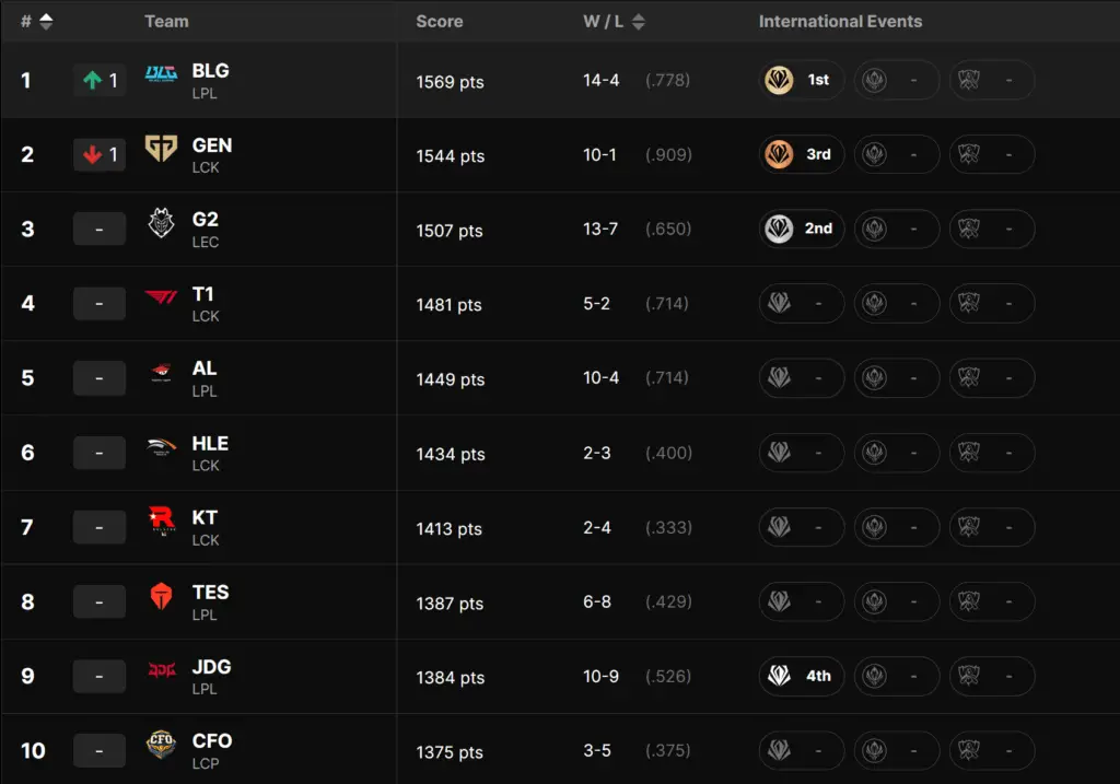 Grâce à son titre à São Paulo, Bilibili Gaming s’empare de la première place mondiale, mettant fin à l’hégémonie de Gen.G, désormais deuxième. La défaite sèche des Sud-Coréens face à G2 en demi-finale (0-3) a lourdement pesé dans la balance, alors qu’ils étaient considérés comme les grands favoris du tournoi. De son côté, G2 Esports profite pleinement de son parcours jusqu’en finale pour grimper sur le podium, dépassant T1 d’une courte marge d’une trentaine de points. Une progression significative pour les Européens, qui retrouvent enfin les sommets après plusieurs années sans finale internationale.